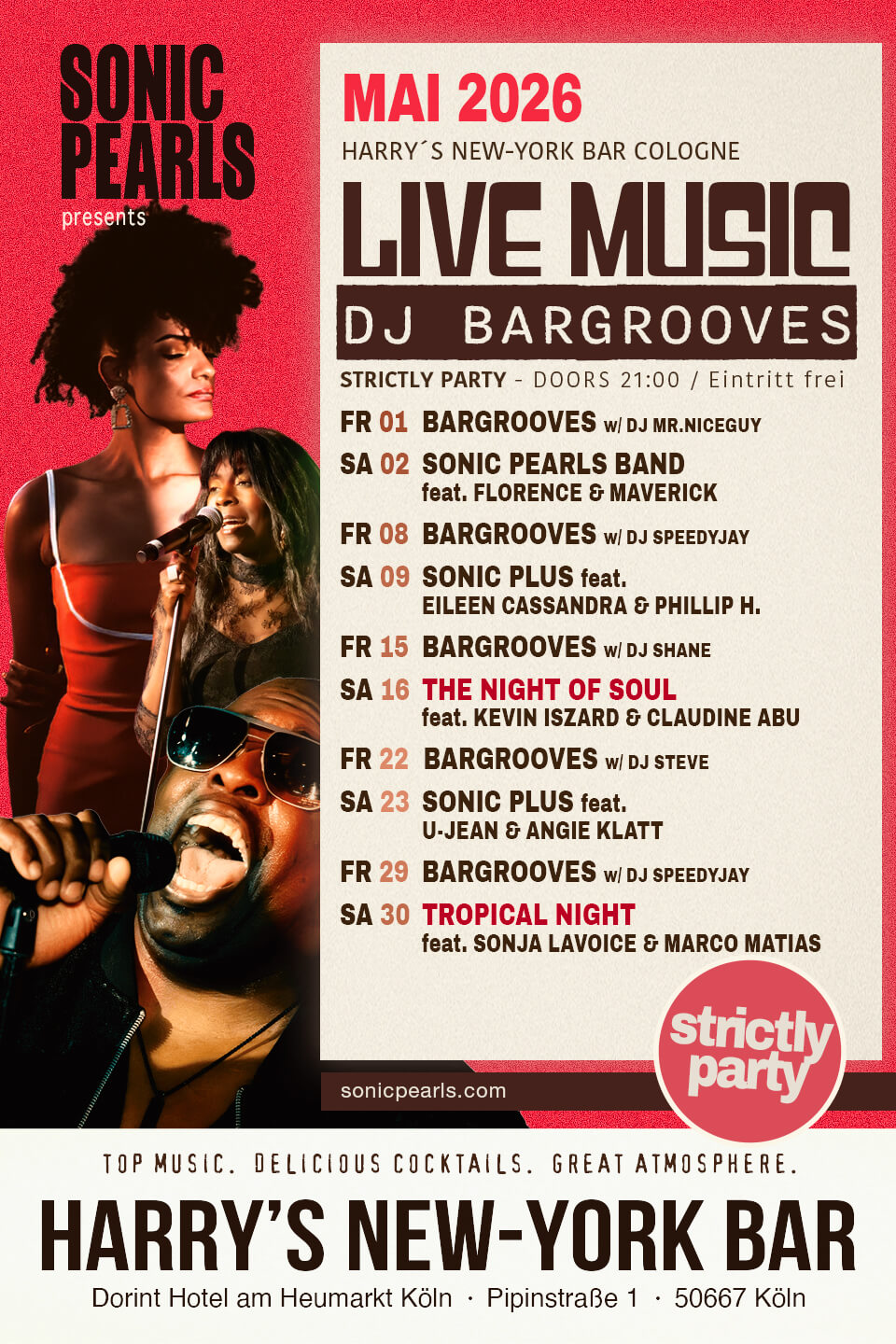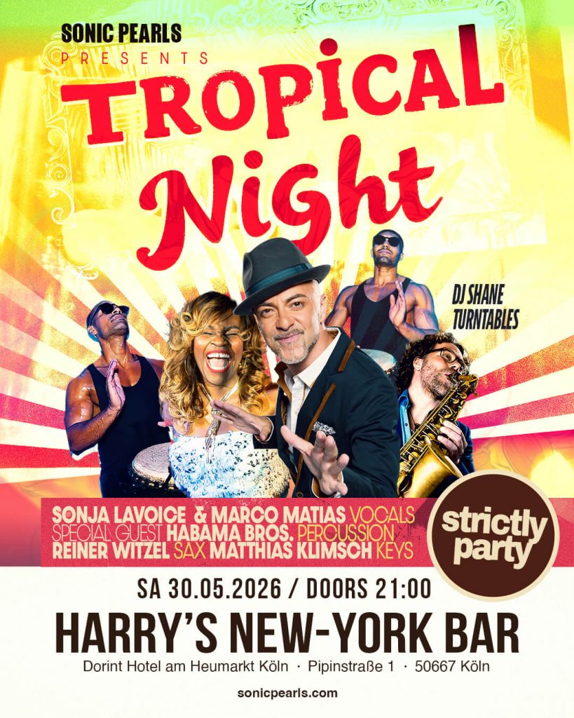 Welcome2TheClub! Euch erwartet ein fettes Programm im Mai inkl. einer Tropical Night und der kultigen Night Of Soul. Immer am Freitag: Sonic Pearls Dj Edition „Bargrooves“ – und jeden Samstag „strictly Party“ mit pulsierender Live Music Band. Freuen uns schon auf Euch in Köln´s Cocktail-Tempel No1: Harry´s New-York Bar.